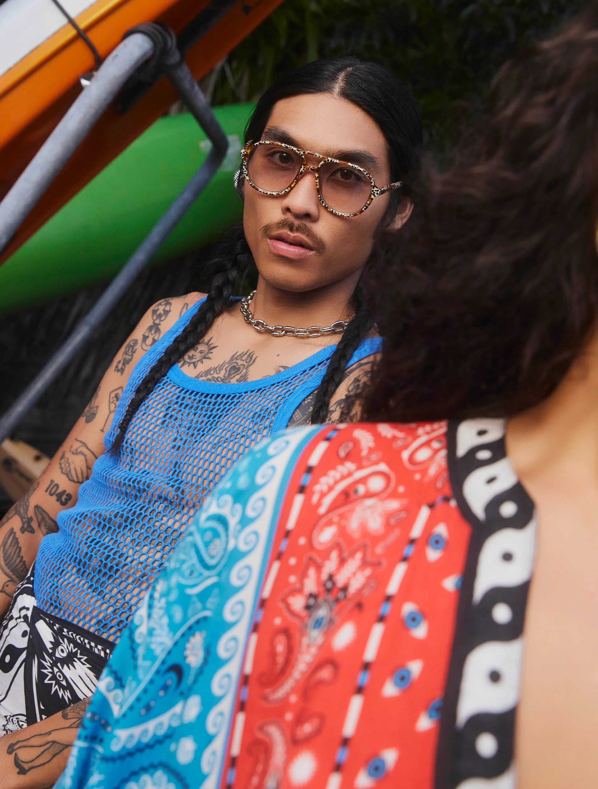 This lightweight aviator features a inner gold metal frame paired with a torti spotted acetate and grey/brown gradient CAT 1 UV-protected lenses.