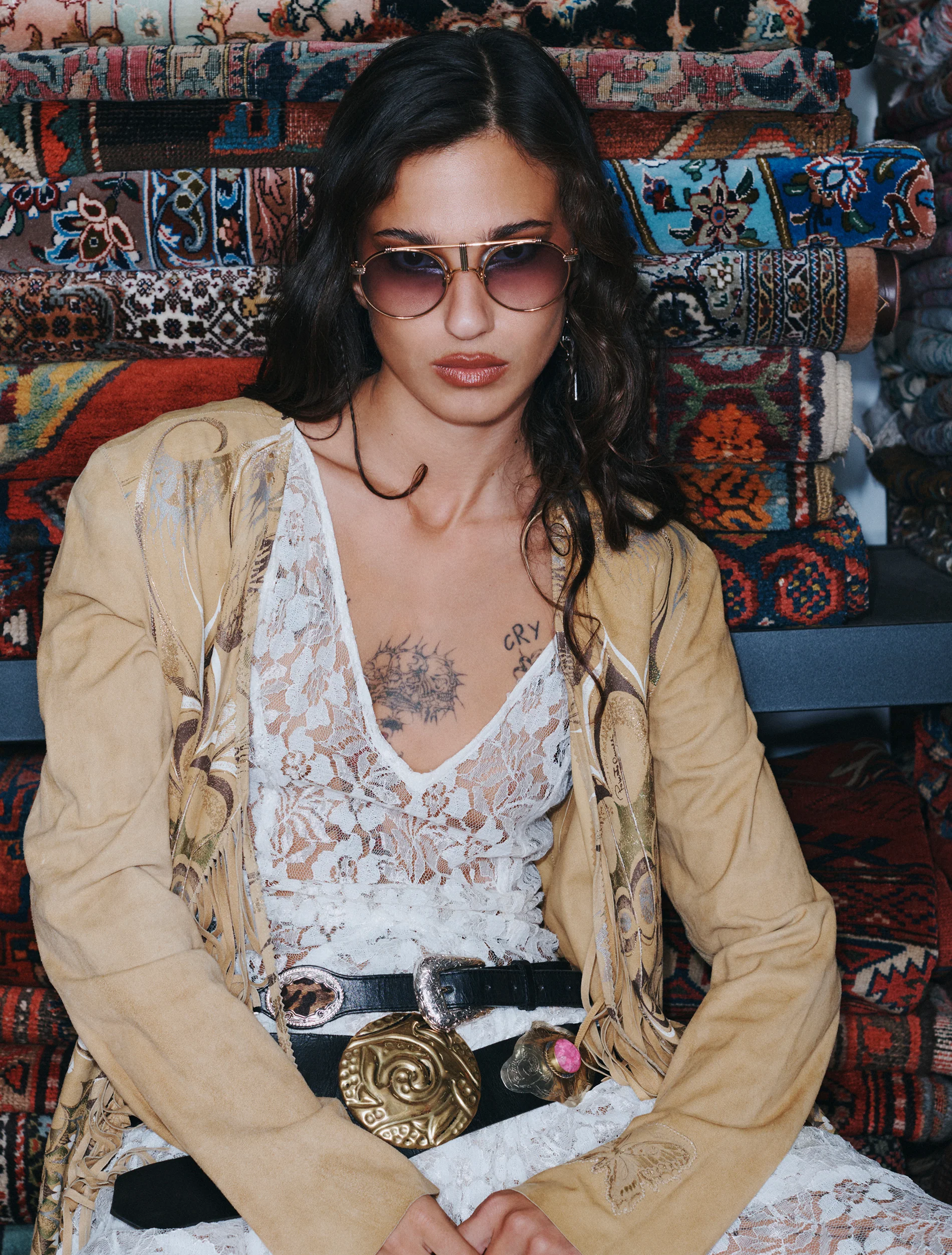 Round frames with a double bridge design in gold tone metal. Features a grey tinted CAT UV1 protected lenses.