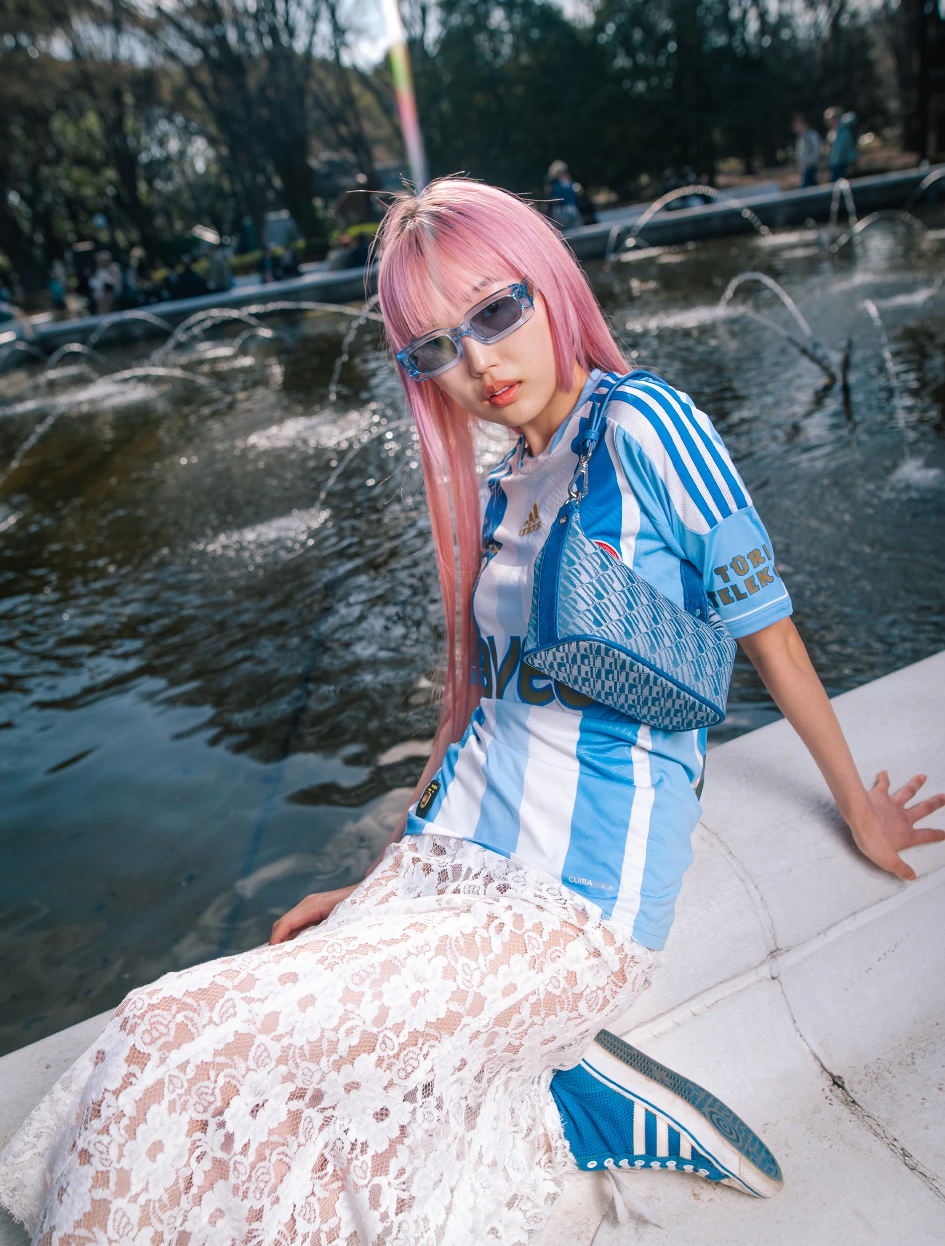 Made from high quality transparent ice blue acetate with wire temples and matching blue UV protected Category 1 lens.