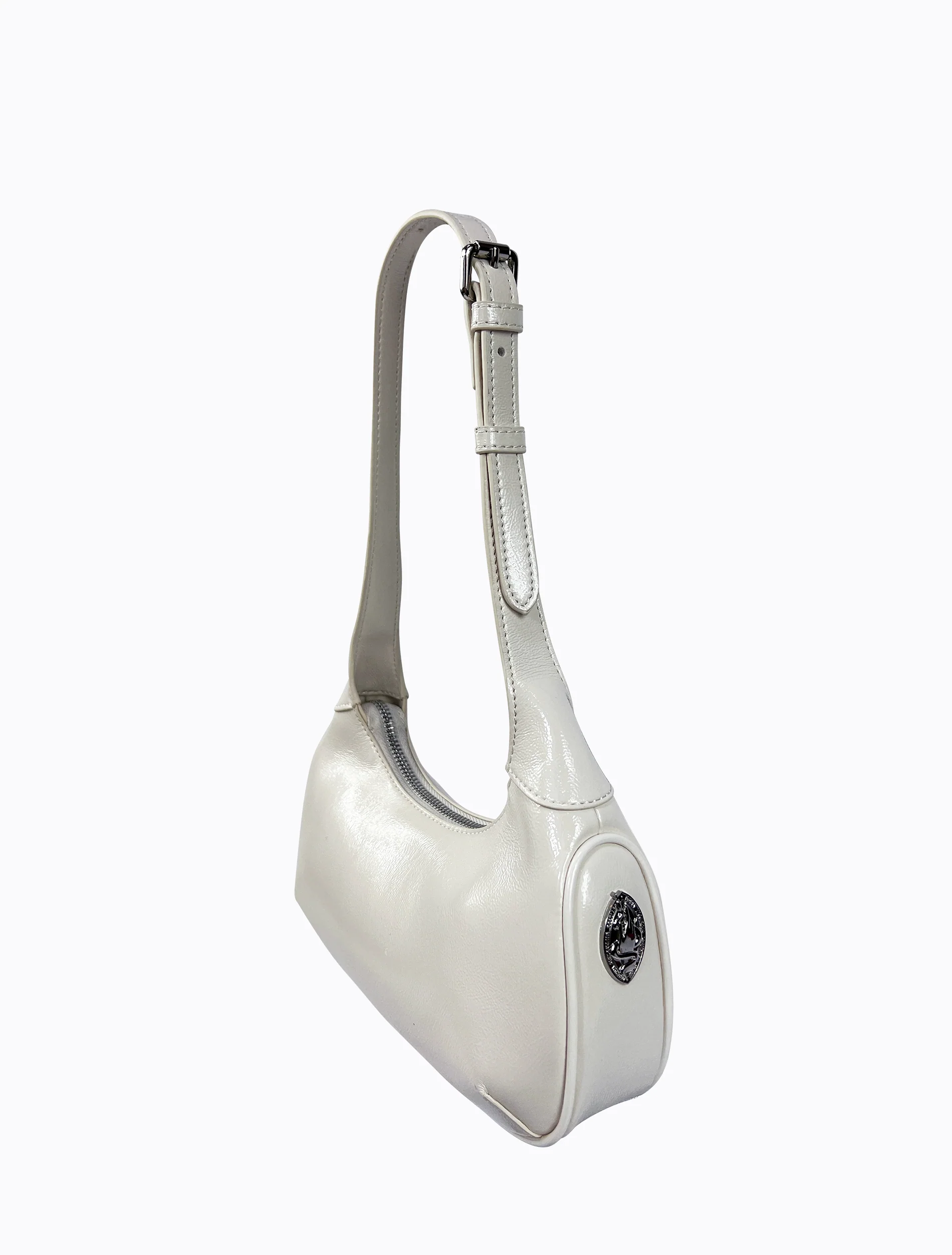 A classic curved shoulder bag with removable crossbody strap made from high quality shiny blanc white faux leather. Lined in R-PET fabric which is spun from post-consumer plastic bottles otherwise destined for landfill, with silver hardware throughout and two pockets inside.