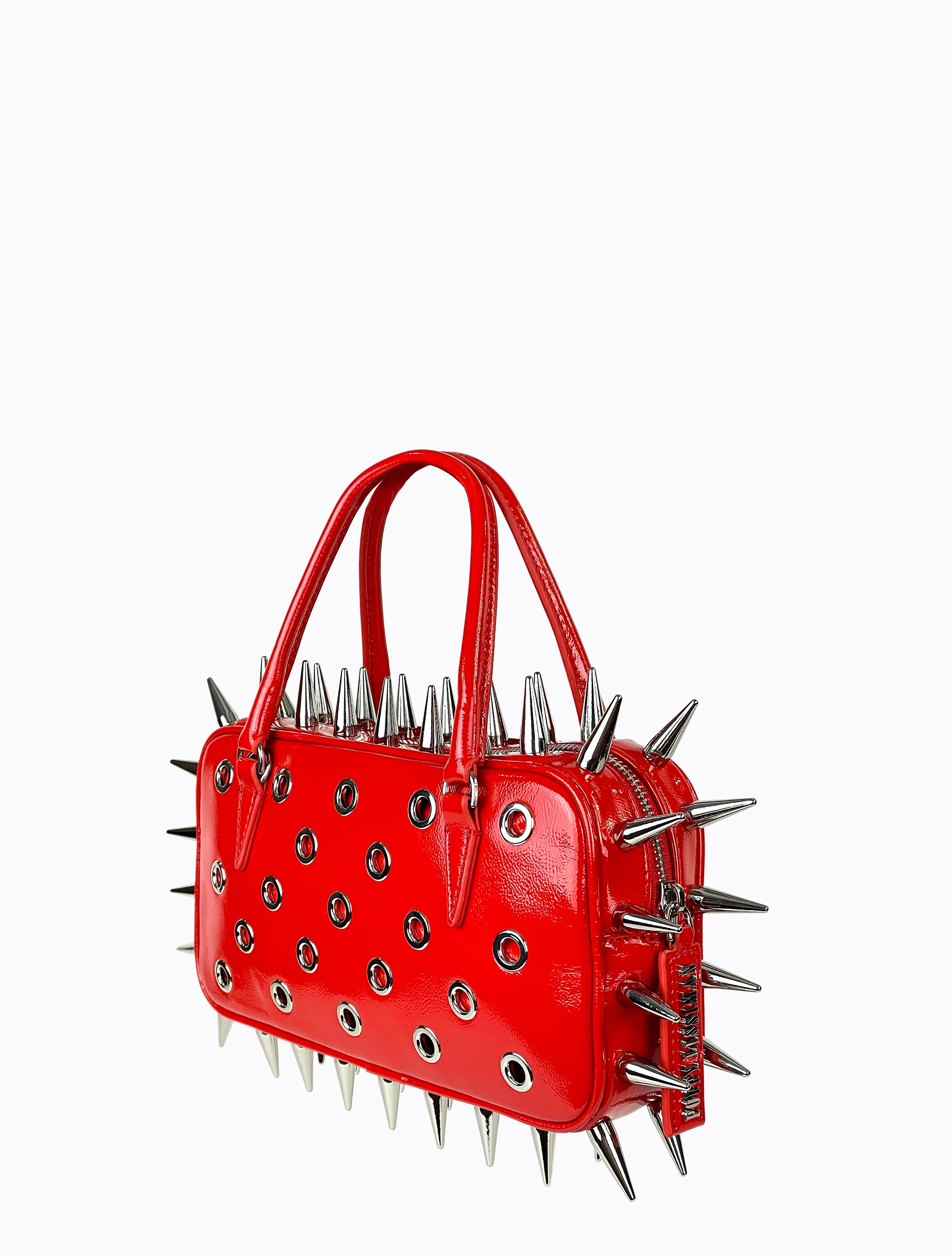 The Snapper Spike is made with high quality shiny cherry red faux leather and features silver eyelets on the body, a spike border and custom Poppy Lissiman name plate zip puller. The bag comes equipped with an additional detachable shoulder strap, providing several ways to wear.